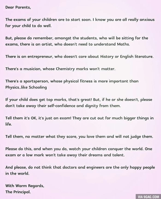 What they need from you is for you to tell them that you believe in them, that their marks do not define them, and that you will love them regardless of what marks they come home with. “They already know this”, you may think, but you would be surprised at the catastrophising thought process some children go through when they experience failure, especially if it is for the first time. A principal said it best in a letter sent home to parents during exam period, “Tell them, no matter what they score, you love them and will not judge them. Please do this, and when you do, watch your children conquer the world”. The rest of the letter is below.